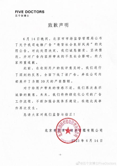6月14日晚,“五個(gè)女博士”也在其微博發(fā)布致歉聲明稱(chēng),對(duì)此處罰決定,誠(chéng)懇接受、堅(jiān)決整改,并對(duì)廣告內(nèi)容所帶來(lái)的不良社會(huì)影響,向大家鄭重道歉。