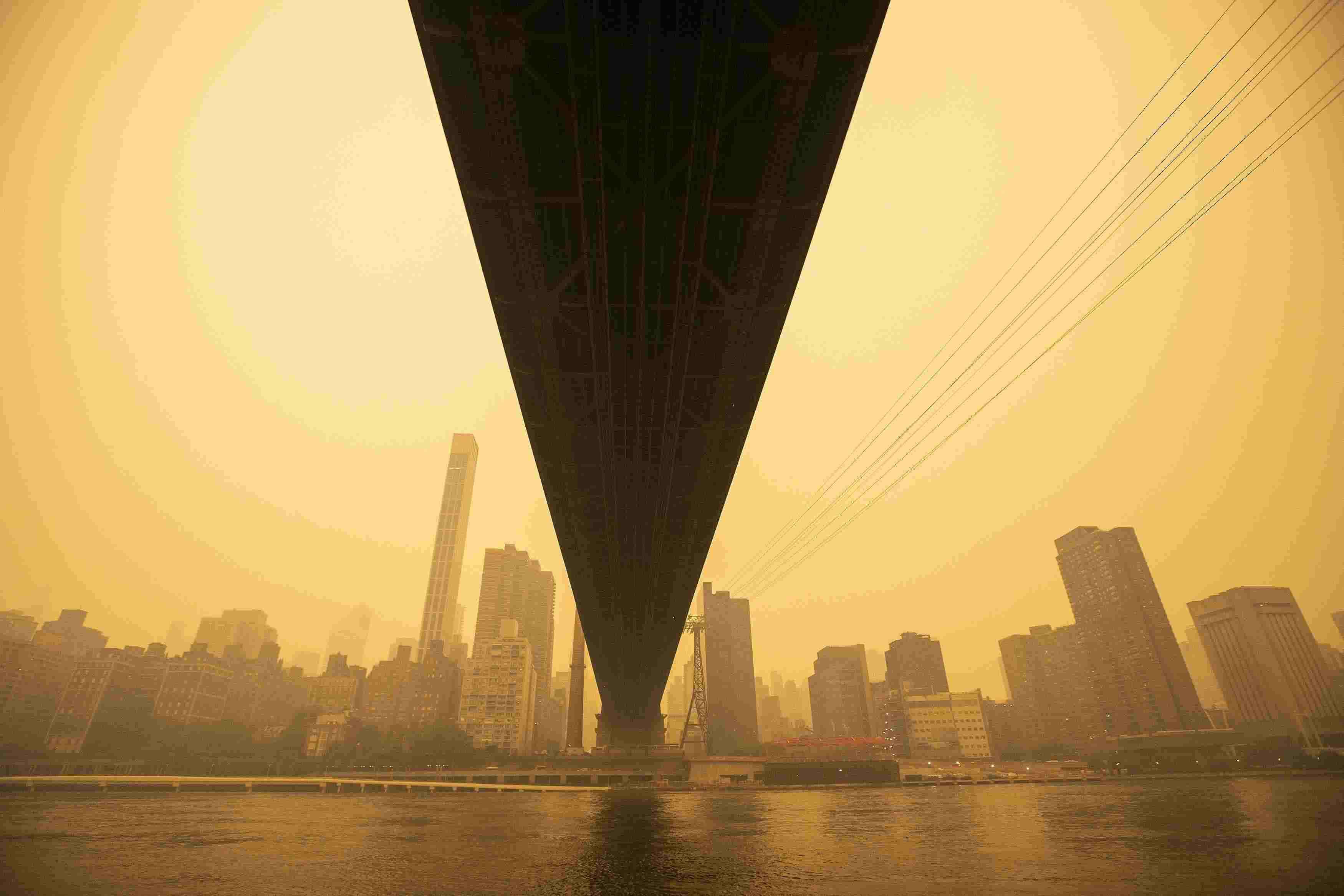 當?shù)貢r間2023年6月7日,受加拿大野火煙霧持續(xù)南下影響,美國紐約籠罩在“橙色霧霾”中。當天,紐約成為全球空氣污染最嚴重的城市。 視覺中國