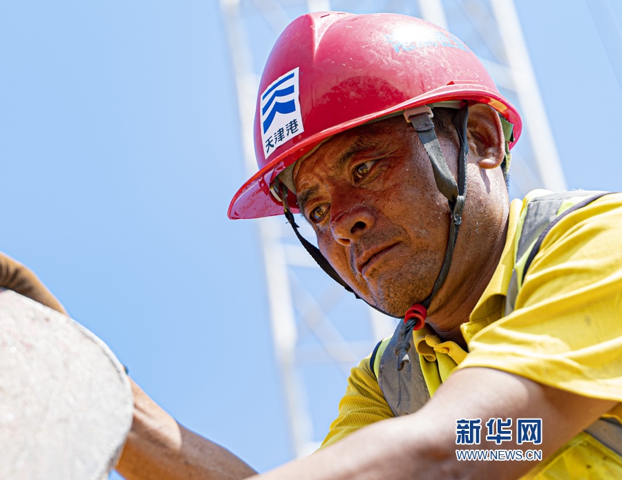 烈日下,建設(shè)工人在天津港c段智能化集裝箱碼頭建設(shè)現(xiàn)場(chǎng)進(jìn)行安裝樁體工作。新華網(wǎng)發(fā)