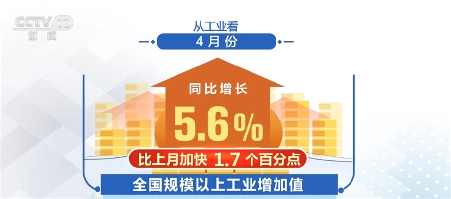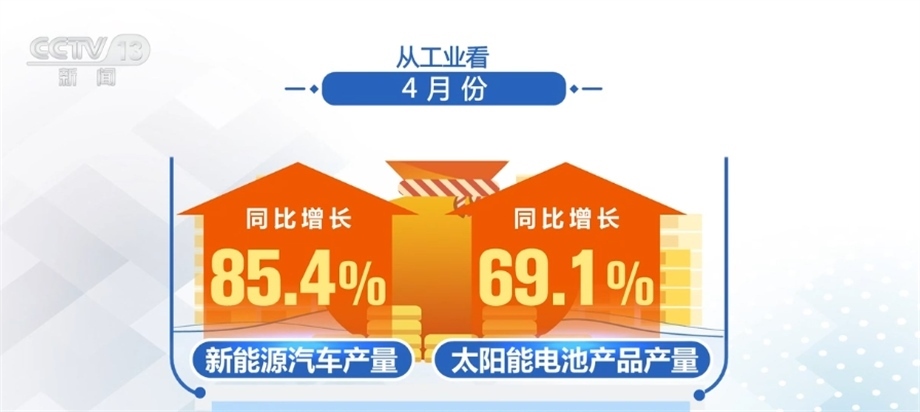 從工業(yè)看,4月份,全國規(guī)模以上工業(yè)增加值同比增長5.6%,比上月加快1.7個百分點,其中,新能源汽車、太陽能電池產品產量同比分別增長85.4%和69.1%。