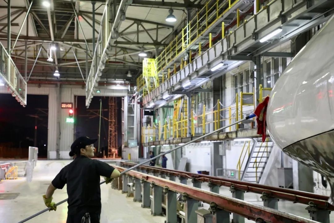 動車組經(jīng)過洗車機時,調度室內調度員精準聯(lián)控司機,機房有專業(yè)的設備操作人員負責監(jiān)控,確保洗車機正常運轉,外皮清洗到位。在動車檢修庫內,質檢員全方位卡控人工清洗環(huán)節(jié),檢查清潔是否到位。