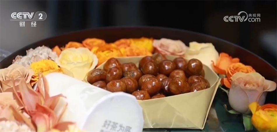 一些商家也是緊跟潮流,順勢推出“入冬四件套”禮盒。這家花店把鮮花、奶茶、糖葫蘆、糖炒栗子組合起來售賣,受到許多消費者的歡迎。?