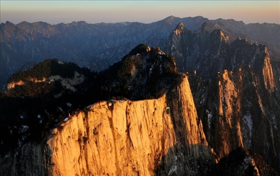 春節(jié)假期,西岳華山每天有超2萬(wàn)人次的游客登山觀景。圖為日落時(shí)分的華山群峰。