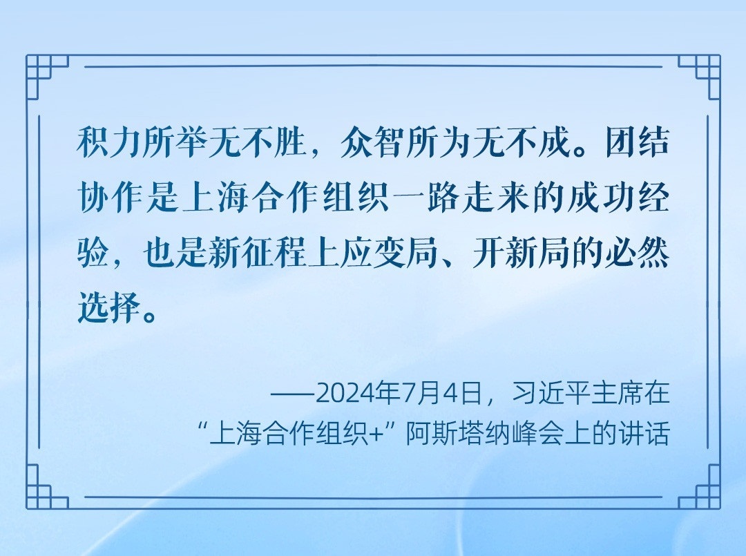 在上海合作組織這個(gè)世界上人口最多、幅員最遼闊的大家庭,好鄰居心連心、好朋友肩并肩、好伙伴手牽手,不斷拓展互利合作、共同發(fā)展的廣闊空間,朝著實(shí)現(xiàn)現(xiàn)代化的宏偉藍(lán)圖,在可持續(xù)發(fā)展之路上不斷邁進(jìn)。