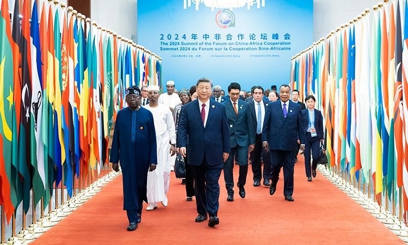 2024年9月5日,習(xí)近平主席在北京人民大會(huì)堂出席中非合作論壇北京峰會(huì)開幕式并發(fā)表主旨講話。這是習(xí)主席同外方領(lǐng)導(dǎo)人共同步入會(huì)場(chǎng)。