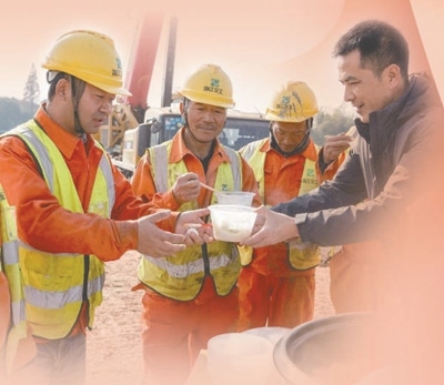 浙江省湖州市長興縣泗安鎮(zhèn)東村村干部為高速改擴建項目施工人員送餃子。
