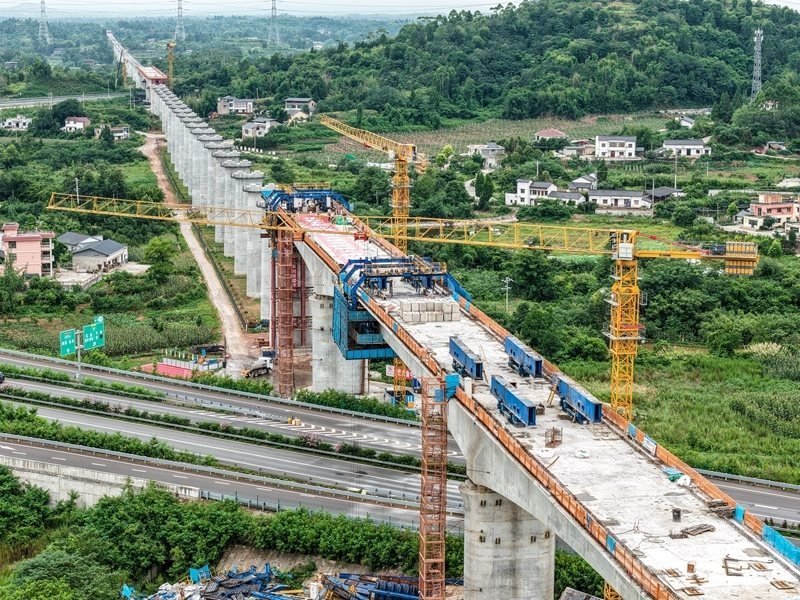當日,由中鐵五局承建的成渝中線高鐵土橋樞紐互通雙線特大橋連續(xù)梁順利合龍,該連續(xù)梁全長約242米,是成渝中線高鐵重慶段跨度最大的連續(xù)梁。土橋樞紐互通雙線特大橋位于重慶市銅梁區(qū),全長3271.6米,上跨重慶三環(huán)高速及銅安高速公路,共設(shè)有92個橋墩,2個橋臺。