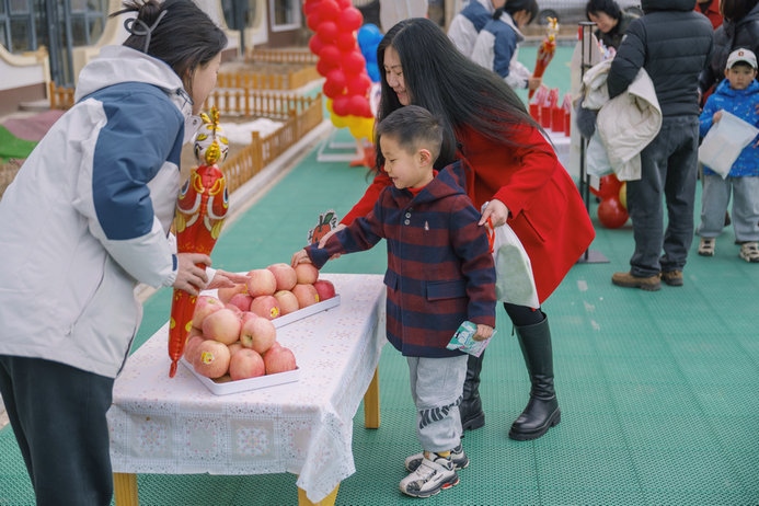 在老師的一聲聲祝福中,小朋友們興奮地摸著充滿寓意的蘋果、橙子、棒棒糖等。