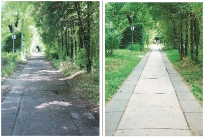 左圖:保護(hù)項(xiàng)目對(duì)燕南園水泥路修復(fù)前的景象。右圖:保護(hù)項(xiàng)目對(duì)燕南園水泥路進(jìn)行修復(fù)后的效果。燕南園保存下來(lái)的水泥路以“脫漿彩石混凝土”工藝進(jìn)行施工,老校友稱之為“洋灰路”。這里的“洋灰路”已有76年歷史,大部分仍能正常使用。北大建筑與景觀設(shè)計(jì)學(xué)院的李迪華老師發(fā)現(xiàn),燕南園東側(cè)水泥路破損后,顯露出大小和顏色都參差不齊的石子。于是,他開(kāi)始追溯這些“洋灰路”的歷史價(jià)值,與北大“燕園公益營(yíng)建社”的黃可同學(xué)翻閱北大檔案館資料,找到了歷史照片。又幾經(jīng)輾轉(zhuǎn),尋訪到了九旬高齡的老校友。研究發(fā)現(xiàn),燕園中最早的水泥路修建于1948年。為此,李迪華大力呼吁保護(hù)這些水泥路,尋訪到專門修復(fù)歷史路面的施工團(tuán)隊(duì),對(duì)少量保存完整的路面進(jìn)行修復(fù);破損的洋灰原料則被回收,取出原骨料,采用相同的工藝進(jìn)行還原。不僅老材料得到循環(huán)利用,歷史道路的價(jià)值也“凝固”在更新后的路面中。