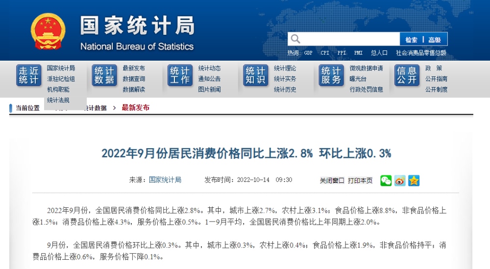 2022年9月份,全國居民消費(fèi)價(jià)格同比上漲2.8%。其中,城市上漲2.7%,農(nóng)村上漲3.1%;食品價(jià)格上漲8.8%,非食品價(jià)格上漲1.5%;消費(fèi)品價(jià)格上漲4.3%,服務(wù)價(jià)格上漲0.5%。1--—9月平均,全國居民消費(fèi)價(jià)格比上年同期上漲2.0%。