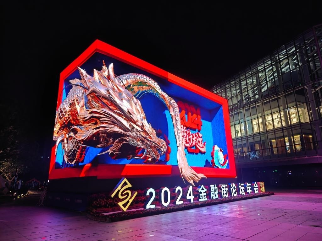 2024金融街論壇年會(huì)的會(huì)場外設(shè)置展示大屏。新華社發(fā)