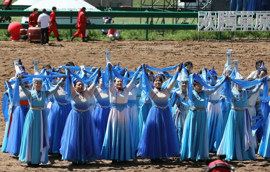 伴著悠揚(yáng)的歌聲,踏著激昂的步伐,在旗幟方隊(duì)的引領(lǐng)下,哈達(dá)方隊(duì)、民族方隊(duì)、烏蘭牧騎方隊(duì)、牧馬人方隊(duì)、裁判員及運(yùn)動(dòng)員方隊(duì)依次走進(jìn)會(huì)場(chǎng)。隨著彩煙燃放,氣球升空,那達(dá)慕在梅林組合的歌曲《歡騰那達(dá)慕》中拉開帷幕。隨后,歌伴舞《石榴花開》等節(jié)目輪番登場(chǎng),現(xiàn)場(chǎng)觀眾掌聲雷動(dòng),讓來自全國(guó)各地的游客在紅石崖高山牧場(chǎng)領(lǐng)略了草原的柔情。