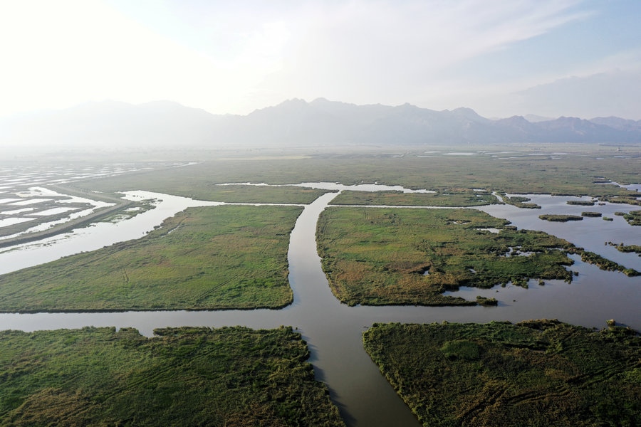 夏日的哈素海濕地,湖水清波蕩漾,水鳥(niǎo)嬉戲成群,山湖相映,一派生機(jī)。