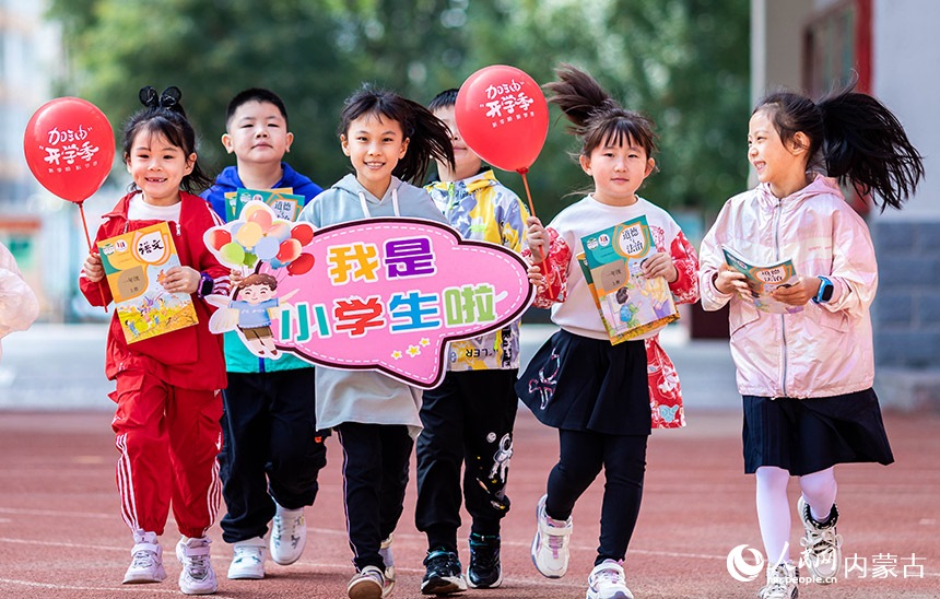 呼和浩特市玉泉區(qū)南柴火市街小學(xué)的一年級新生們手持新教材,開心的奔跑在校園內(nèi)。丁根厚攝