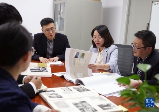 4月28日,在上海市檔案館的辦公室內(nèi),利用部工作人員方華(右二)和同事們討論策展工作的細節(jié)。