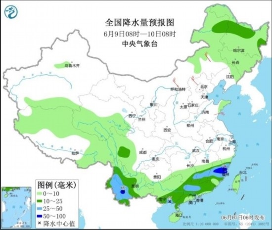 7-9日,江南、華南、云貴高原、四川南部等地有中到大雨,局地有暴雨,小時雨量20-50毫米,局地可達(dá)60毫米以上;華北、黃淮、東北地區(qū)等地有陣雨或雷陣雨,局地伴有雷暴大風(fēng)或冰雹等強對流天氣,中央氣象臺6月7日06時發(fā)布強對流天氣藍(lán)色預(yù)警。