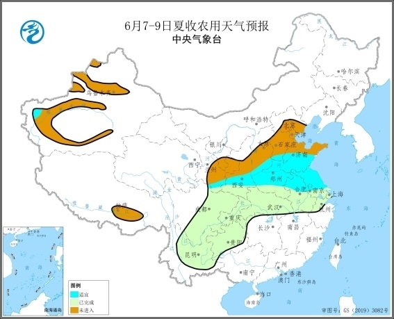 預(yù)計6月7-9日,夏收區(qū)大部多晴好天氣,利于搶晴收曬已成熟冬小麥和加快夏收進度;河南、陜西等地前期降水偏多地區(qū)的低洼麥田漬澇將減輕,為麥收機械化作業(yè)逐步創(chuàng)造條件。未來3天,河北中東部和南部、河南北部、山西東南部、山東西部、安徽東部等地的局部地區(qū)將有雷暴大風或冰雹等強對流天氣,冬小麥點片倒伏風險較高,對未成熟小麥籽粒充分灌漿不利,并將增加已成熟小麥機收難度。7-14日華北、黃淮、新疆等地部分地區(qū)將有35℃以上高溫天氣,局地日最高氣溫在37℃以上,上述地區(qū)堆積的濕麥發(fā)熱霉變的風險較高,新疆冬小麥遭受干熱風災(zāi)害的風險也較高。