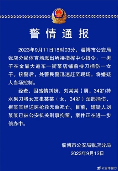 ·淄博警方通報(bào)男子捅傷女友:女子經(jīng)搶救無效死亡,嫌疑人被刑拘。