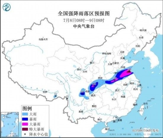 全國強降水落區(qū)預報(7月8日08時-9日08時)