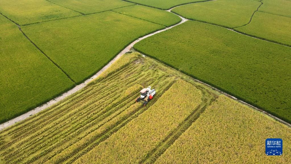 2022年9月28日,合肥市肥西縣花崗鎮(zhèn)河豐社區(qū)村民駕駛收割機(jī)收獲中稻(無人機(jī)照片)。新華社發(fā)(徐勇攝)