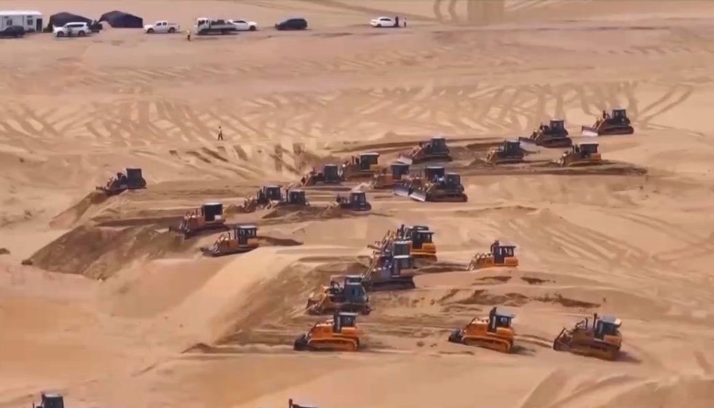 在內(nèi)蒙古鄂爾多斯的茫茫沙海中,近200臺推土機來回穿行,推平高低起伏、連綿不斷的沙丘,以便后續(xù)在此安裝光伏板。這正是當下最新的光伏治沙模式中的一個環(huán)節(jié)。