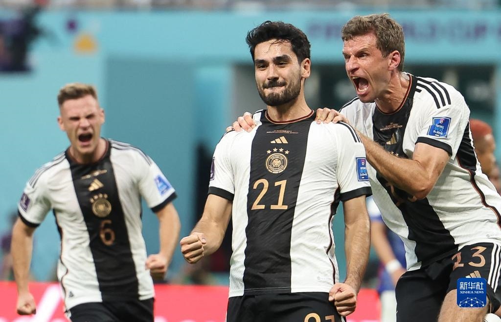 11月23日,德國(guó)隊(duì)球員伊爾凱·京多安(中)進(jìn)球后慶祝。新華社記者 潘昱龍 攝
