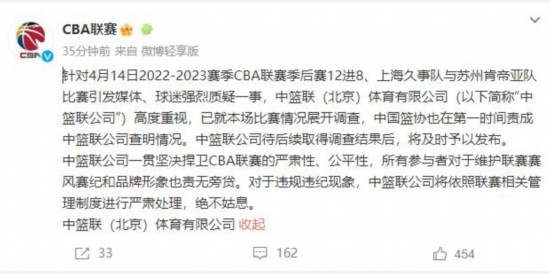 CBA聯(lián)賽官方微博15日凌晨發(fā)布消息表示:針對(duì)4月14日2022-2023賽季CBA聯(lián)賽季后賽12進(jìn)8、上海久事隊(duì)與蘇州肯帝亞隊(duì)比賽引發(fā)媒體、球迷強(qiáng)烈質(zhì)疑一事,中籃聯(lián)(北京)體育有限公司(以下簡(jiǎn)稱“中籃聯(lián)公司”)高度重視,已就本場(chǎng)比賽情況展開(kāi)調(diào)查,中國(guó)籃協(xié)也在第一時(shí)間責(zé)成中籃聯(lián)公司查明情況。中籃聯(lián)公司待后續(xù)取得調(diào)查結(jié)果后,將及時(shí)予以發(fā)布。