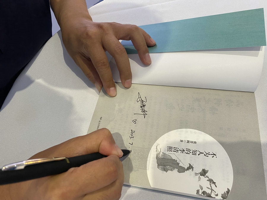 圍繞某些宋人作品中記載的李清照“流落以死”、李清照卒年的多版本說(shuō)法、李清照的詩(shī)詞風(fēng)格為什么會(huì)從婉約轉(zhuǎn)變到豪放等“疑點(diǎn)”,張晉閣先生為大家講述了《不為人知的李清照》的寫作緣由、研究經(jīng)歷、文字表達(dá)形式和內(nèi)心希冀。隨后,兩位讀者分別提出“您最喜歡李清照的哪一首詩(shī)詞”、“對(duì)李清照的寫作產(chǎn)生深遠(yuǎn)影響的人是誰(shuí)”這兩個(gè)問(wèn)題,張晉閣先生分享了自己的看法并朗誦了優(yōu)美的詩(shī)詞佳作,現(xiàn)場(chǎng)交流、互動(dòng)氣氛熱烈。活動(dòng)結(jié)束后,張晉閣先生為讀者朋友們簽名留念。多位年輕讀者表示,通過(guò)閱讀《不為人知的李清照》,加深了他們對(duì)古典詩(shī)詞的喜愛(ài)。