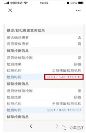市民7天內(nèi)所做的核酸檢測結(jié)果會在健康碼綠碼下方顯示,7天之后信息會轉(zhuǎn)到綠碼下方的“個人健康風險評估(初步流調(diào))表”中,點擊后可查看最近3次的核酸檢測結(jié)果。核酸檢測結(jié)果具體到日期和具體時點。