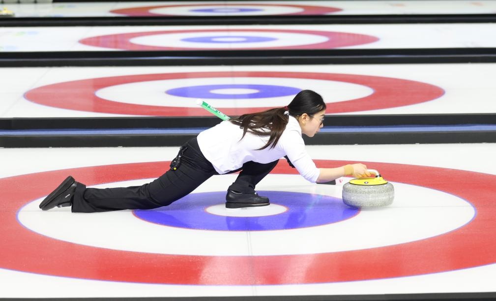 ??1月12日,文馨悅在比賽中擲壺。在第十四屆全國(guó)冬季運(yùn)動(dòng)會(huì)冰壺青年組混雙金牌賽中,黑龍江隊(duì)選手李思霖/文馨悅奪得金牌。新華社記者 王楷焱 攝