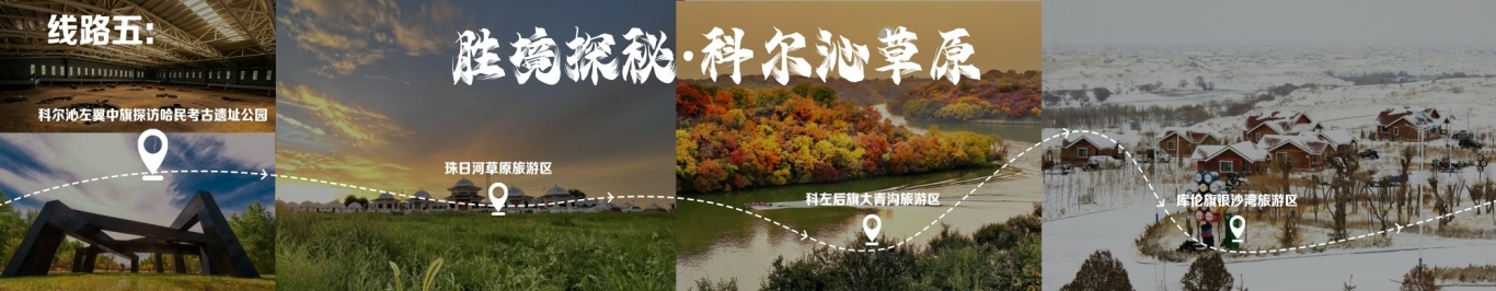 線路行程由通遼出發(fā),至科爾沁左翼中旗探訪哈民考古遺址公園,至珠日河草原旅游區(qū),再至科左后旗大青溝旅游區(qū),終點(diǎn)為庫倫旗銀沙灣旅游區(qū)。