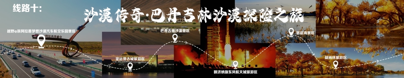 線路行程由阿拉善出發(fā),至參觀越野e族阿拉善夢想沙漠汽車航空樂園景區(qū),至定遠(yuǎn)營古城旅游區(qū),至巴丹吉林沙漠景區(qū),再至額濟(jì)納旗東風(fēng)航天城旅游區(qū),再至居延海景區(qū),終點(diǎn)為胡楊林旅游區(qū)。