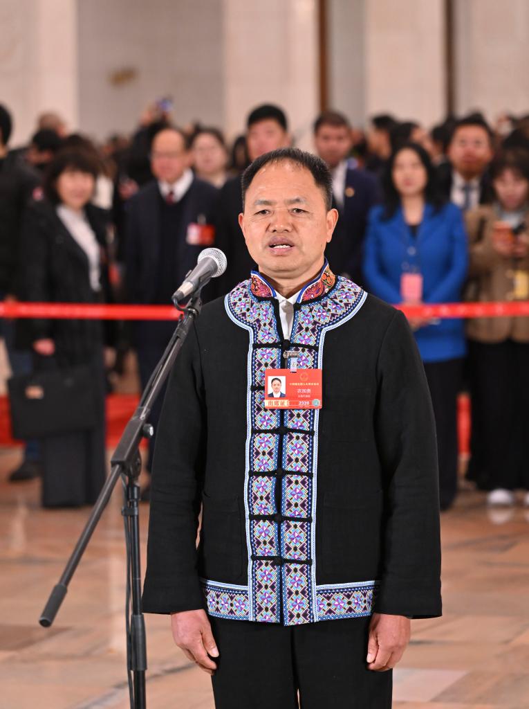 3月5日,第十四屆全國人民代表大會第四次會議首場“代表通道”集中采訪活動在北京人民大會堂舉行。這是全國人大代表農(nóng)加貴接受媒體采訪。