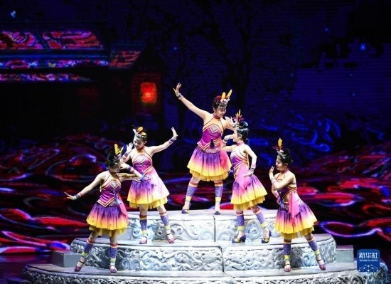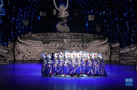 6月5日,演員在貴陽大劇院的《多彩貴州風》演出中表演節(jié)目《踩鼓舞》。