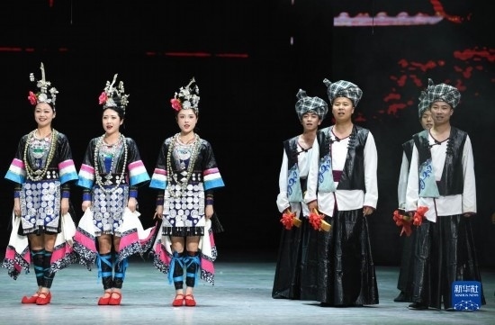 6月5日,演員在貴陽大劇院的《多彩貴州風》演出中表演節(jié)目《金繡銀飾》。