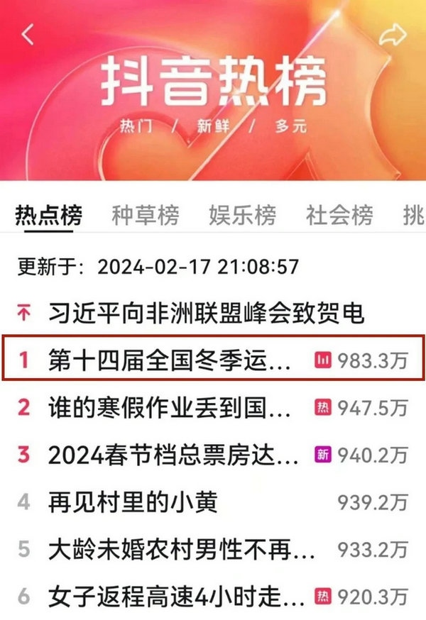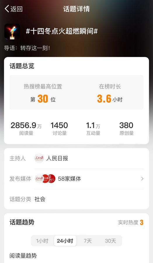 國內(nèi)多家主流媒體對開幕式進行報道,話題#十四冬開幕式# #十四冬點火超燃瞬間#等話題登上微博熱搜榜,閱讀量近8000萬。