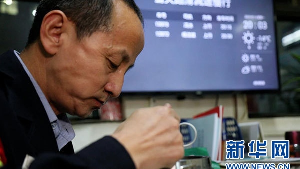 馮冰一邊吃飯,一邊用余光看著調(diào)度表上的時(shí)間。新華網(wǎng) 吳銀冰 攝